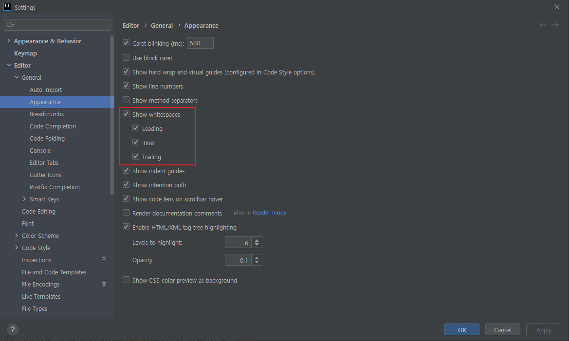 4. Show whitespaces 체크박스 선택(하위 메뉴도 전부)