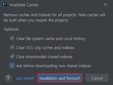 Invalidate and Restart 버튼을 클릭하면, Intellij의 캐쉬를 전부 삭제함과 동시에 자동으로 재시작을 시작한다.