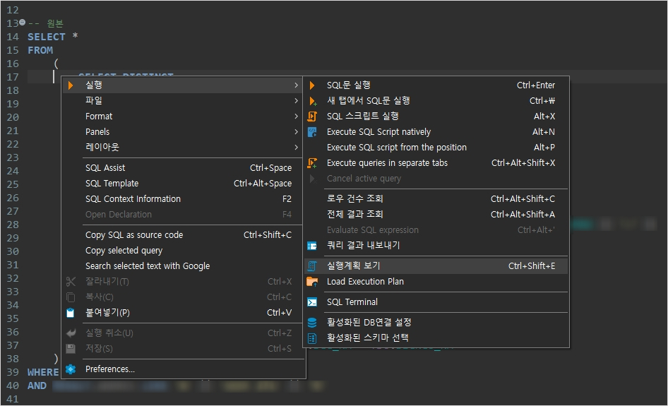 - DBeaver 내 SQL 편집기를 이용하여 Query 구문을 작성하는 경우가 많을 것이다. 작성한 Query 구문에서 우클릭 후 '실행' 탭을 확장하여 '실행 계획 보기' 기능을 사용하면 Query Tuning 시 많은 도움이 된다. (하단의 추가 내용을 참고하자)