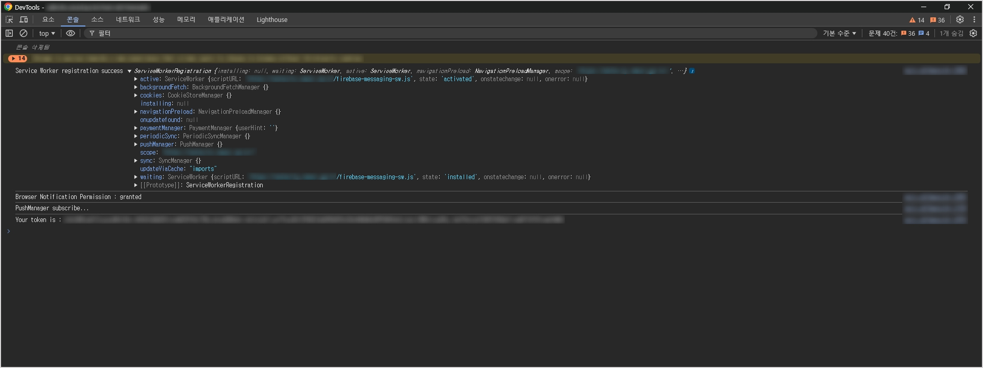 대망의 접속 기기의 토큰을 발급받기 위한 과정이다. 필자의 경우, Service Worker 등록 후 성공하였을 때 토큰을 발급 받을 수 있는 화면을 출력할 수 있도록 처리하였다. Service Worker 등록이 되지 않으면 어차피 토큰을 발급 받을 수 없다. 몇 번이고 테스트를 해보았지만(과거 버전에서는 토큰이 발급되었던 것으로 기억하기에...) 안되는 것은 어쩔 수 없지...