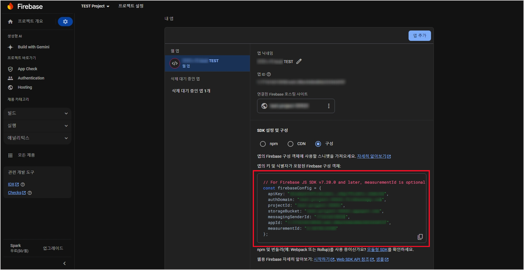'SDK 설정 및 구성' 선택 값이 초기에는 npm 으로 되어있을 것이다. 우리는 JavaScript 값이 필요하니 '구성' 값을 선택하도록 하자. 그럼 firebaseConfig 값을 얻을 수 있다.